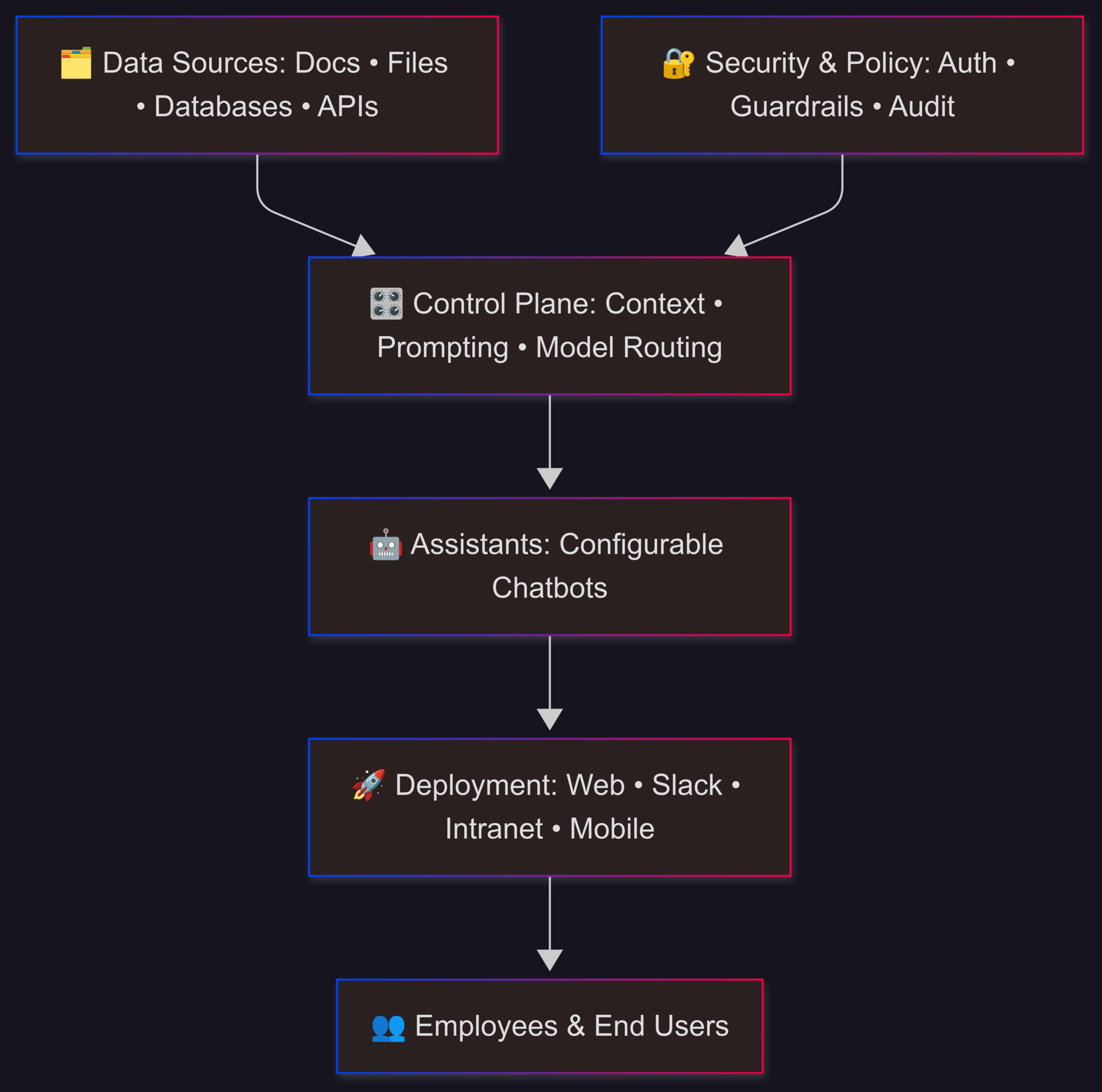 Inputs from apps and data sources flow into a control plane with three layers: policy engine, model router, and audit.